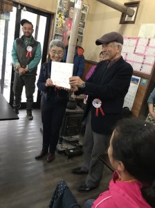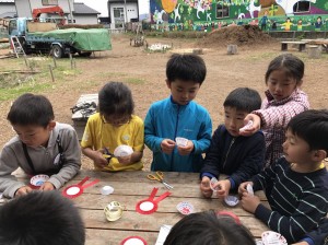 昼食を終え、こすもす公園を出発するまでの時間は鬼ごっこやドロケイ、チーム対抗戦の大縄跳びなど、最後までこすもす公園を広くいっぱいに使って遊びました。そしてついに出発の時間が迫って来ました。最後にお世話になった藤井さんご夫妻、棟梁方、こすもす公園のお手伝いの皆様へ自作したお礼の歌と絵、そしてバッジが子ども達の手からプレゼントがされました。ご夫妻方の胸元に赤色のバッジが飾られます。