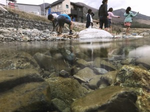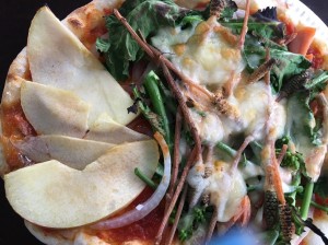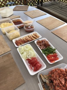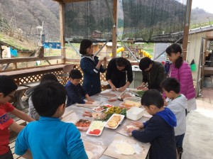 こすもす公園に戻ると、山菜を裏山に採りに行き、近くの清流、甲子川で水切りや足を水面に沈め、思う存分川遊びをしました。「お腹すいた」という声が各所からあがり、毎年恒例の山菜を使ったピザ作りが始まります。一人一人ピザ生地を練って、麺棒で伸ばし、ひょうたん型やハート型、長方形など、様々な形が出来上がっていました。そのオリジナルな生地の上にもまたオリジナルなソースと具材が散りばめられます。具材もユニークな個性派揃いで、チーズに鮭、トマトソースに甲子柿ソース、つくしやワラビなどここでしか味わえない様々な組み合わせのピザが次々に出来上がりました。出来上がった特製のピザは、こすもす公園特製の石窯でこんがりと焼き上げられます。どんどん焼きあがる自分のピザを母屋に運び、お皿に移してから勢いよく口に運んでいました。おかわりとして2枚目を焼く子が続出し、用意してくださった沢山のピザ生地は全て子ども達によって無くなりました。三陸鉄道に続き、大満足な釜石最後の昼食となりました。