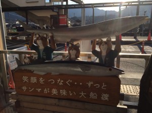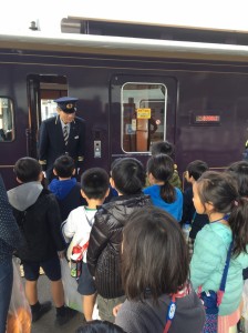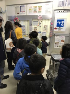 再び滑り込むようにして車内に戻り、折り返し地点の駅まで、朝食をとったり、運転席横に設置されている擬似運転席で車掌さん気分になりながら向かいます。電車はゆっくりと折り返し地点の盛駅に着き、子ども達は元気よく外に飛び出します。周囲は長閑な田舎の住宅地で囲まれ、ホーム横の広場で子ども達全員で鬼ごっこをして10分ほど遊びました。30分ほど車内で揺られていると、長く暗いトンネルの中腹で列車は徐々に速度を落として停車しました。子ども達も「なんで止まったの」と声をあげます。すると吉田さんがマイクを持ち、「東日本大震災が発生した時、列車はこの位置で緊急停止をしました。本部との連絡もつかなくなり、運転手がトンネル内を歩いて近くの民家まで向かい、そこで今起きていることについて知りました。」と説明されました。ここでもまた、子ども達は真剣に耳を向けていました。その長く暗いトンネルを抜け、30分ほど自然の中を走ると再び始発駅の釜石駅に帰ってきました。これにて特別な三陸鉄道の旅は幕引きです。電車を降り、お世話になった列車を画用紙に描きます。特徴的な紫色の車体を上手に描き終え、最後に大変お世話になった吉田さんにサインを頂くとともにお礼を言います。寄り道として駅の横にある魚市場で家族へのお土産を調達します。大満足で手を海産物で一杯にしながら釜石駅を後にしました。