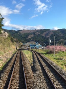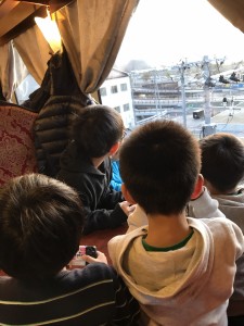 子ども達は心待ちにした様に、どんどんと車内に入ってゆきます。その車内は、西洋基調のシートと天井には桜の造花が装飾されており、シンプルながらに和洋折衷な豪華絢爛さを感じさせてくれる作りになっていました。吉田さんの大きな掛け声とともに、車両はゆっくりと釜石駅を離れてゆきます。発車すると、耳からも普段乗る電車とは違うということに気づきます。子ども達は、常に何かを発見する真新しい声をあげながら前後左右に広がる車窓から情景を眺めようと、車内をいっぱいに使って縦横無尽に歩き回ります。電車はまず釜石の街と防波堤横を通り、吉田さんが東日本大震災での惨劇と被害について「ここまで津波は押し寄せてきました」などと事細かに解説してくださいます。子ども達は車窓から眼前に望めるその現場に対して真剣な眼差しを向け、話を静聴していました。街を抜けると、自然の溢れる海岸沿いの景色に様変わりし、長いトンネルをいくつか通り過ぎると電車はゆっくりと停車しました。ふと左側に目を送ると、そこには群青色の波打つ海面とそこに上から覆いかぶさるように広がる地平線、そして力強い朝日が創り上げる三陸鉄道で一番と言われるにふさわしい絶景が広がっていました。車内からは大きな歓声とインスタントカメラの懐かしいシャッター音が聞こえました。