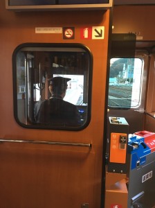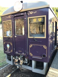 車に乗り込み、いざ釜石駅へ向かいます。釜石駅に到着し、朝早くから今日の特別な車両を運転してくださる車掌の吉田さんにご挨拶を済ませ、階段を駆け上がります。ホームにはおとなしい紫色に包まれるレトロな車両が待ち構えていました。