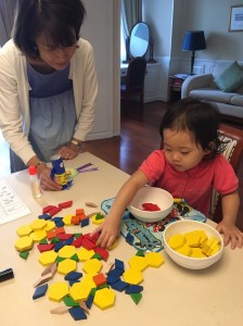 このお稽古のテーマも、今回バンコクで行った他のお稽古と同じように「桃太郎」です。パターンブロックと指示行動を合わせて桃太郎の世界を楽しみますが、まずは導入として身近なお花をパターンブロックで作ってみました。ブロックを並べたり積んだり、手触りの良いカラフルなブロックで遊んでいる感覚で、小さな子ども達の気持ちが高まりました。