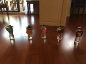 桃太郎の登場人物の絵に色を塗り、パターンブロックを置いたり、折り紙で登場人物を折り、のりやテープで貼って工作に展開させたりしました。ペットボトルを使えば輪投げに発展し、トイレットペーパーの芯を使えばお人形ができました。このように身近なものを使っていろいろなものを作り、遊びを広げていくことがとても大切です。2歳児には折り紙は難しいですが、軽く折り目をつけたところを指でなぞるなど、できること、そして「自分で作った!」という気持ちにつながることは色々あるものです。