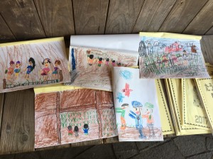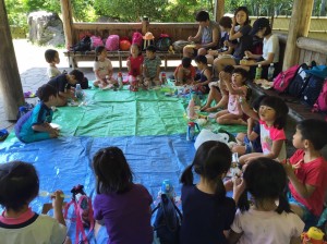 田植え作業が終わるとみんな腹ペコです。泥を洗い、お弁当を食べる城山公園へと向かいます。途中で湧泉に立ち寄り、子供達は澄んだ水で軽く水遊びをしたり、ウスバキトンボやシオカラトンボを観察しました。この付近は蛍が有名で夜には蛍の綾なす光がとても美しいそうです。公園に着くと、お弁当をいただきました。子供達は沢山働いたからか、あっという間にお弁当を完食しました。お弁当の後はお絵かきタイム。この公園には錦鯉が泳ぐ綺麗な池があり、子供達はその周りでそよ風に吹かれながら今日の田植え作業の絵を描いていました。全身泥んこになったお友達の様子や、一生懸命苗を植えている自身の様子など、一人一人個性あふれる絵でした。