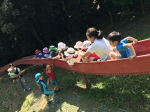 お絵かきタイムの後は待ちに待った公園での自由時間。子供達は朝から沢山働いたのに、まだまだ元気で、公園で目一杯遊んでいました。皆でネットに乗って磯辺先生に揺らしていただいたり、長い滑り台を滑ったりととても楽しそうでした。あっという間に帰る時間になり、子供達は着替えておやつを頬張って出発です。電車やバスの中では皆くたくたで、寝てしまう子も沢山いました。