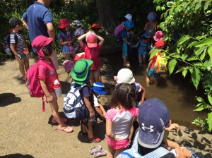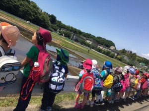 雲ひとつない晴天の朝、「おはようございます!」という元気な挨拶と共に、田園調布駅には子供達が徐々に集まり、賑やかになってゆきます。今日は田植え遠足。子供達はつばが広めの帽子を被り、洋服の中も水着を着て準備は万端です。子供達は「今年もカエルいるかな」と駅からそわそわしていました。ペアを作って、お父様お母様にお別れのご挨拶をし、電車に乗り込みます。横浜駅での乗り換えは混雑しており少し距離がありましたが、ペアできちんと手を繋いでスムーズに乗り換えることができました。