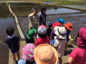 田んぼにつくと、水着にTシャツ、サンダル姿になり田植えの準備を万端にして、お茶摘み遠足でもお世話になった松本さんにご挨拶をしてお話を伺いました。松本さんはお米に関してのお話をしてくださったり、田植えの方法を教えてくださいました。