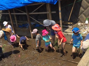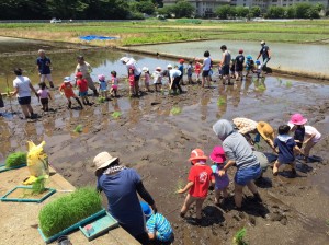田植えでは主にもち米とうるち米の二種類に分かれるということ、各地域ごとに『あきたこまち』や『ひとめぼれ』など様々な品種があり、今回伺ったレンゲの里では『さとじまん』という神奈川県産の品種を植えていることや、苗を二本ほど取り、シャープペンのように持って植えるということをお伺いしました。スタッフの指示に従って子供達は田んぼに入ってゆきます。毎年田んぼのグジョグジョした感触を気持ち悪がる子がいるのですが、今年はそのような子は一人もおらず、逆に「気持ちいい」という子がいるほどでした。ここ数年、スタッフの方が、子供達が田植えをスムーズに出来るように田んぼにメジャーを張ってくださっていたのですが、今年はさらに進化して、メジャーに赤と青のラインがひかれており、より一層植えやすくなりました。