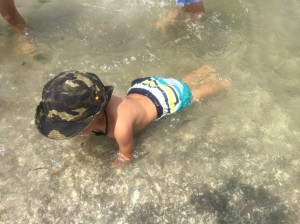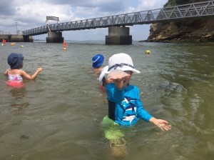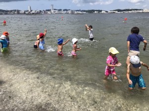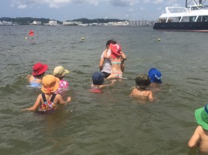 日常生活を送る東京から少し移動しただけで、全く違う環境、大自然の中にいることに子ども達はうきうきしています。早速水着に着替え、砂浜で遊びます。海に入ったり貝を拾ったり、1時間半くらいを過ごすなかで、りみちゃんが着衣水泳をしながら遊んでくれました。海には刺される心配のない白クラゲがいて、子ども達は手のひらにのせようと大はしゃぎ、クラゲの様子をよく観察していました。年少さんは6人参加していましたが、どの子も怖いもの知らずで顔を水につけて水しぶきをあげて楽しんでいました。