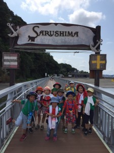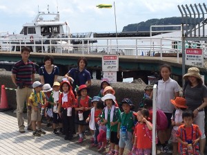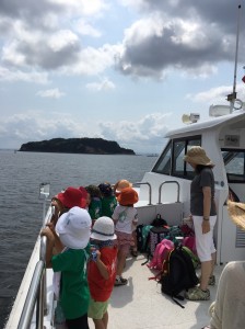 7月20日に年少、年中、年長クラスの子ども達と一緒に、東京湾にある無人島、猿島を探検して参りました。遠足というといつもは小学生のお兄さんお姉さんも一緒ですが、この日は終業式の学校が多く小学生は参加できませんでした。でも、りみちゃんは一緒です!さらにいつもの遠足と様子が違うのは、大学生のお兄さんお姉さんが試験期間中だということ、いつも絵や工作を教えてくださっている村上先生が同行してくださるということです。