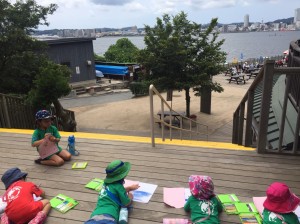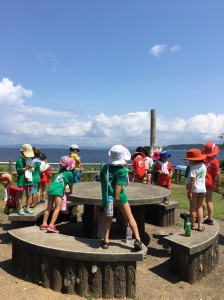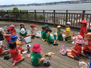 11時過ぎになり早めのランチタイムにしました。デッキの上でおいしいお弁当をいただきます。その後はお絵描きです。デッキからは一面に海、遠くには船が見えます。ここにはカモメがいないかわりにトンビが!ランチタイムには子ども達のお弁当を狙って上空をぐるぐる飛んでいました。おかげで羽を広げたトンビの様子をよく見ることができました。