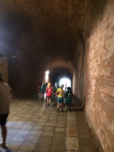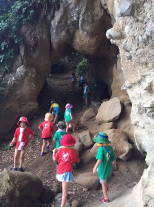 午後は年少チーム、年中・年長チームに分かれて島を探検しました。年少チームは島を半周し、トンネルの中で声が響くことに感動したり、小さなセミの抜け殻を見つけたり、様々な種類の蝶を見て動きを真似たりしていました。階段もへっちゃら!疲れを見せずに大喜びで進みました。年中・年長チームは島を一周し、洞窟の中へも入ってみました。島では木陰が涼しく、海の近くで吹く風は東京とは全く違うものでした。