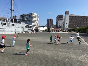 戦艦三笠が保存されている横須賀の船着き場に着くと、大学生のお姉さんが待っていてくれました。午前に試験を終えたお姉さんと、これから試験を受けるお姉さんがここで交代するためです。子ども達が大好きなお兄さんお姉さん。忙しい大学生活のなかに、こひつじかいの子ども達との時間を持ってくれることに感謝です。船を降りると、近くの公園で影踏みや鬼ごっこをしたり、アメンボを見たりして遊びました。