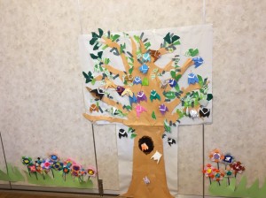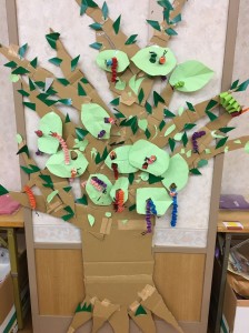 新幹線で折ったセミを一本の木にたくさん貼り、セミの木ができました。