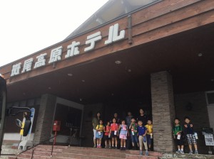 お迎えの大型バスに乗り、斑尾高原に向かいます。初参加も多い年長さん。きっとドキドキの緊張もあるのか、なかなか元気はつらつとはいきません。りんご畑、山の景色などを見ながらホテルに着くと、りさ先生とウッキーがお出迎え。ほっとしたのか、記念写真の時には、ニコニコになりました。前乗りをして準備してくださっている大広間に向かい、荷物の整理をしたらすぐにホテル探検。
