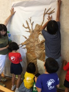 休む暇なくお部屋を緑でいっぱいにするように、早速みんなで力を合わせ、大きな木を作ります。