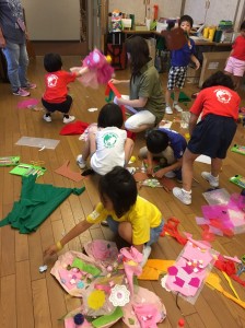 そして、森の妖精作りをします。それぞれが自分の妖精をキャンプの準備でおうちで考えてきました。それをもとに、おはながみや布、ポンポンや葉っぱなど、お部屋中に広げた沢山の材料を好きに使って、手にはめられる人形を作っていきます。