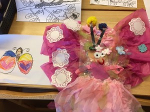 かまきりを元にしたり、ちょうちょやクワガタを元にしたり、カラフルな本当に可愛い妖精たちが10体生まれました。最初は、少々難しそうに取り組んでいた子供達でしたが、たくさんの材料に埋もれているうちに、あたかも妖精になったかのように、色々試行錯誤、工夫して作り上げます。まるで夢の世界で作業をしているよう。指示されたことをきちんとやることが得意な年長さんにとって、この自由な課題はかなり難しいですが、やってみて、時間をかけてみると楽しみも覚えてきたようです。