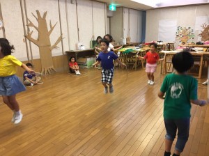 初日から盛り沢山の工作とお絵かきの後は、縄跳びタイムで体を動かします。毎日の日課は、必ずやります。