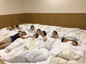 高原での1日は、とても有意義な時間が流れます。ペーパーもして、隙間時間を見つけては、お庭を走り回り、ダンケをしたり、木でできたブランコに乗ったり、休む暇なく動き回ります。大きな温泉、そして星空が見える露天風呂に入り、今日1日の疲れをとり、1日目は終了しました。まだ年長さんだけなので、大広間でも走りまわれるほど。そんな中にフカフカのお布団が敷かれていて、ぐっすりお休みタイム。森の妖精たち、素敵な夢が見られますように。