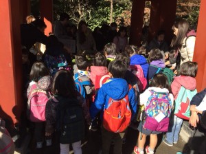 2019年初めての遠足は、子ども達が先生やお友達とニコニコの笑顔で交わす新年の挨拶から始まりました。お見送りにきたお父様お母様にお別れのハグをして、田園調布駅を出発。鎌倉駅に着くまでの電車の中ではお正月に作ったおせち料理や年末年始の過ごし方についてお友達同士楽しそうにお話していました。電車を乗り継ぎ、1時間程かけようやく鎌倉駅に到着。