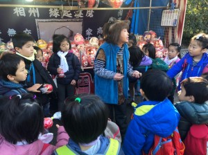 お参りが終わると次はだるま屋さんに行きます。だるま屋さんには色々な大きさや色のだるまが沢山並んでいます。その中から子ども達も赤色のだるまを1人1個ずつ受け取ります。そして、円になって、火打石を鳴らしてだるまに願いを込めて頂きます。子ども達も「よよよい!よよよい!よよよいよい!」と声を合わせました。だるま屋さんからチョコバナナのプレゼントまで頂いたので、お十時に美味しくいただきました。