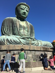 鶴岡八幡宮を出ると鎌倉小町通りを通って鎌倉駅に戻り、バスに乗って鎌倉大仏のある高徳院を目指します。バスの中でも子ども達は元気いっぱい。降りる駅に着くまでみんなお友達同士沢山お話していました。バスが到着し、高徳院の中に入ると大きくそびえ立つ大仏様が見え、子ども達は少し興奮気味の様子。そして、大仏様のお隣の石にみんなで座って子ども達が待ちに待ったお昼ごはんの時間です。子ども達のお弁当の中には黒豆などお正月を感じさせるおかずが並んでいました。お母様方が愛情を込めて作ったお弁当はとっても美味しかったようで、みんなあっという間に食べ終えて、すぐに大仏様の絵を描きにいってしまいました。大仏様の色を表現するのが難しいようでしたが、思い思いに水色や黄緑色を使ってとってもとっても上手に描くことができました。