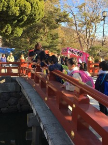 そこから大きな鳥居をくぐり、鶴岡八幡宮まで参道を歩いて向かいます。参道の幅が少しずつ狭くなっている秘密を聞いた子ども達は、途中で横一列に並んで「本当に狭くなっている!」と実感していました。鶴岡八幡宮に着くと本殿を目指してペアになって列で進んでいきます。長い階段もみんなへっちゃらで子ども達はどんどん登っていきます。そして、本殿に着くと先生にお参りの仕方を教わり、慣れない様子でみんな二礼二拍手一礼をしてお祈りします。