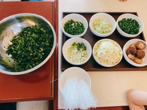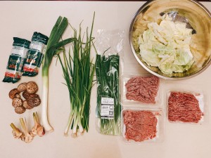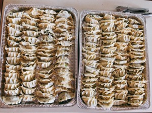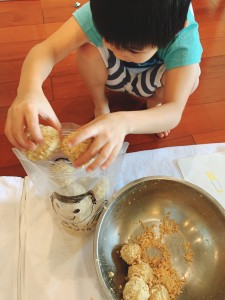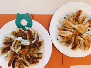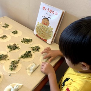 「今日は餃子でしょ?」と昨日に続けて参加している子ども達は、朝から張り切った表情です。昨日とは違い、絵本を読んだら早速餃子づくりを始めました。全員が餃子は食べたことはあっても、実際に作ったことがある子はごくわずかでした。餡を一から作ることで、何が入っているのかもだんだんわかってきました。包むのも初めてですが、一つ一つ丁寧に作っていくうちに形も整い、みんなで作った数はなんと160個!作っている間には数のクイズもして、頭も同時に働かせます。机いっぱいにきれいに並んだ餃子をみて「餃子屋さんみたい!」と達成感いっぱいです。