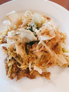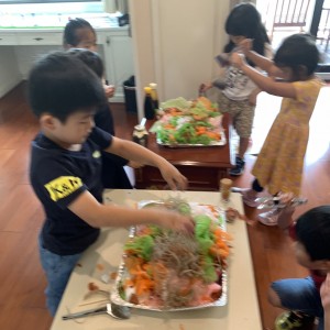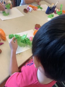 絵本「やきそばばんばん」を読みました。テンポよく焼きそばが出来上がっていく様子に子ども達はあっという間に引き込まれます。そのあとで今のお話に出てきた材料を登場人物も含めて思い出しながら、順番に作り上げていきました。全ての材料が整ったら、焼きそばづくりスタートです。包丁の代わりにはさみを持ち、まるで絵本の世界へ入ってしまったかのような様子で美味しそうな焼きそばを作り上げました。盛り付けて食べる真似をしていると本当にお腹が空いてきてしまったので、休む暇なくクッキングに取り掛かりました。絵本も読み、工作もしたので焼きそばを作るイメージはばっちり!出来上がった焼きそばをみて子ども達はとっても嬉しそうでした。野菜やきのこなど具材たっぷり、ボリューム満点の焼きそばをあっという間に見事に完食しました。