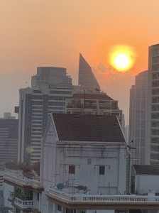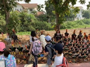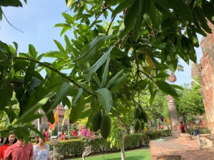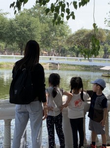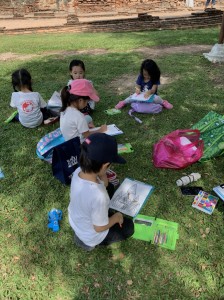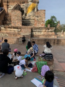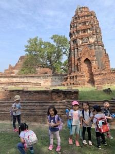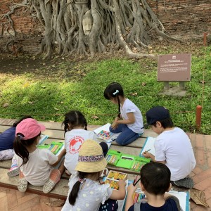 1時間くらい車を走らせ、タイらしい真っ青な空が広がり始めた頃、アユタヤ県に入りました。早朝だったので、のんびりとしたワット・ヤイチャイモンコン。子供たちは、ヤイチャイモンがまるで写真のように目に飛び込んできたようで、目を真ん丸に。たくさんある石像をとおりぬけ、しばし空間にマッチするように、芝生をはしります。そして、目の前にそびえたつ煉瓦でできているたてものを描きます。この寺院のシンボルは、3基の仏塔。ここは、トライローカナート王時代1448年に建立。トライローカーナート王とその息子の遺骨が収められています。たくさんの仏像をが並んでいる姿に子供たちは目を見張り、朝早かったので、「この仏像は、裸でかわいそう!」ということで黄色の袈裟と蓮の花を供えてみます。見るもの見るものが新鮮。王の眠る塔にのぼります。一段一段がたかく、足を大きく上げないといけません、急な石段は子供たちにとっては大きな山のぼり。元気な子供たちは挨拶をしながら、まっしぐらに登ります。登頂の部屋には、何体もの金の仏像。真ん中には、下までのぞける賽銭箱があり、改めてその高さに驚きました。たくさんの仏像には、タイ文字で書かれている名前があり、興味津々の子供たち。あゆみ先生に丁寧に教えていただきました、すると目の前には純金に覆われたきらびやかな大きな立仏像が現れます。このキラキラに照らされ子供たちは、恩光が差しました。王様が大好きだった鶏。周りには所狭しと鶏がまつられていました。ほかに、大きな横たわっている寝仏像も拝みます。そのそばには、タイのマンゴーの木に緑色の実が鈴なりになっていました。大きな立仏像の名前がこの寺院の名前「プラ・シーサンペット」になったそうです。