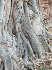 ここも門をくぐると、大きな塔がそびえています。とても広いところにそびえて立つ塔、そして、足元には、石の山。そこを通り抜けると、大きな菩提樹がありました。実は石の山ではなく、頭や、手足が取れたたくさんの仏像だったことは、初めて木の中の頭を見た時に、子供たちは?をもちはじめ、その周りの仏像一つ一つを観察し始めました。素直な気持ちで、「どうして治してあげないの?」「どうしてとれちゃったの?」「お顔はいたくないの?」などなど矢継ぎ早に疑問がわきます。