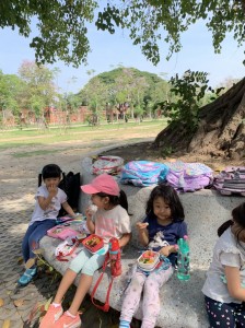 朝から活動的な子供達。頭も身体も存分に使って、冒険をしているので、お腹がペコペコ。バンコクだと普段からなかなか歩いたり外で遊び、飛び回る時間が少ないのに加えて、最近はPM2.5で休園になることが多かったようで、久しぶりに伸び伸びと楽しんだ様子。