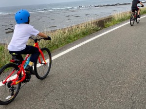 久しぶりの自転車だった昨日とは打って変わって自転車の感覚を取り戻した子ども達は日本海を横目に気持ちよく坂道を駆け下りました。