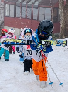 ある程度滑れるようになったら、「何事も自分で」が上達のカギです。スキーウエア、小物、靴などの着脱、転んだ時に起き上がるなどのちょっとした場面の積み重ねで見違えるほど成長していきます。