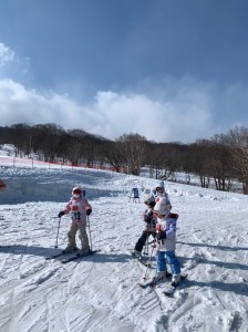 身支度をしてすぐにスキー教室です。今日は全員リフトに乗ってスタートです。一番上の班の小・中学生は自分たちのことはもちろん、幼稚園生がリフトに乗るのをサポートしてくれます。昨日が久々のスキーだったチームも足が慣れてきて滑っている表情にも余裕が出てきました。新たにストックも持って滑る子もいました。