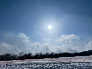 午後は雨が予報よりも早く上がり、全員でリフトに乗りました。リフトで雲を抜けていくと青空が広がっていました。雲の中を通りながら一生懸命滑る練習をし、気づくと雲を抜けロッジラーに到着していました。