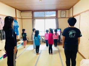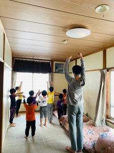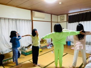 小・中学生部屋、幼稚園生女の子部屋・男の子部屋に分かれて元気よく体を動かします。また限られた空間なので、動きの向きを全員で揃えないとぶつかってしまうこともあり、普段以上に右左も意識していた気がします。